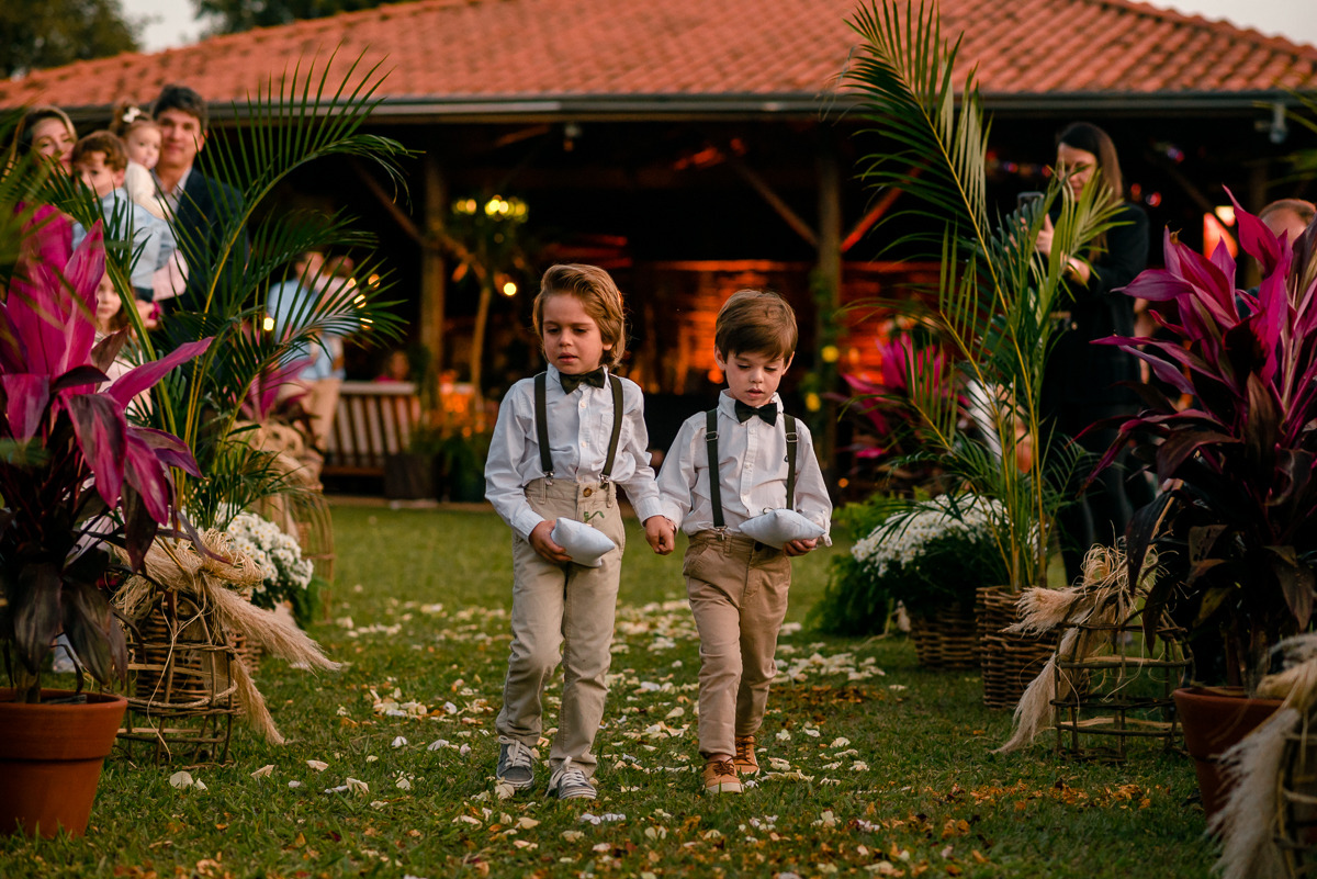 Durante a cerimônia, as daminhas e os pagens continuam a encantar. Elas espalham pétalas de flores com graça (ou não tanta graça assim, o que é igualmente encantador), e eles carregam as alianças com uma seriedade que derrete corações. A espontaneidade das crianças traz uma leveza única para o momento solene.